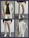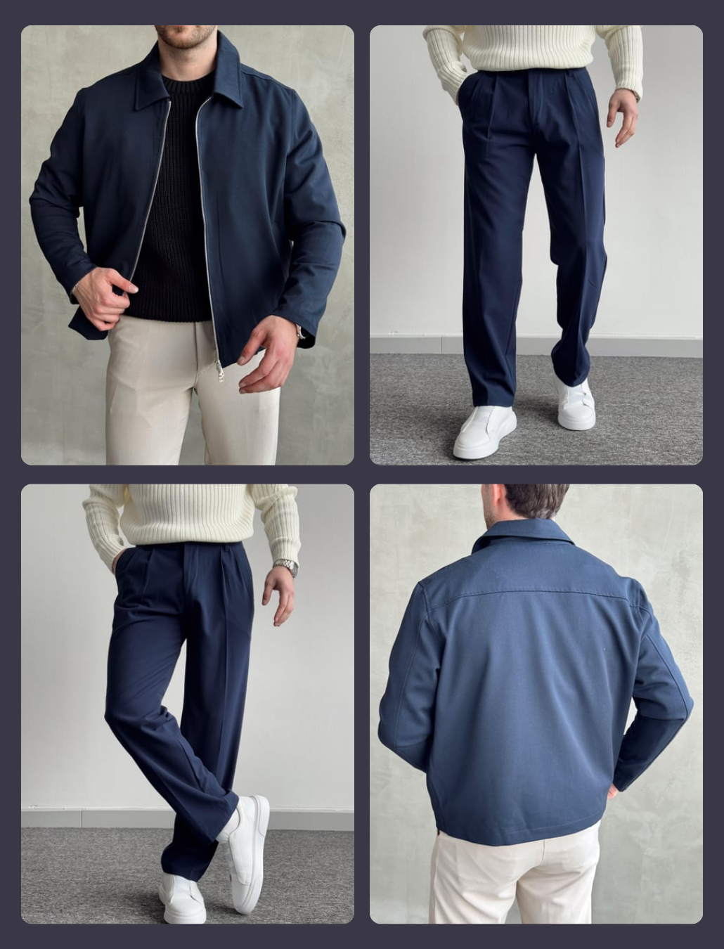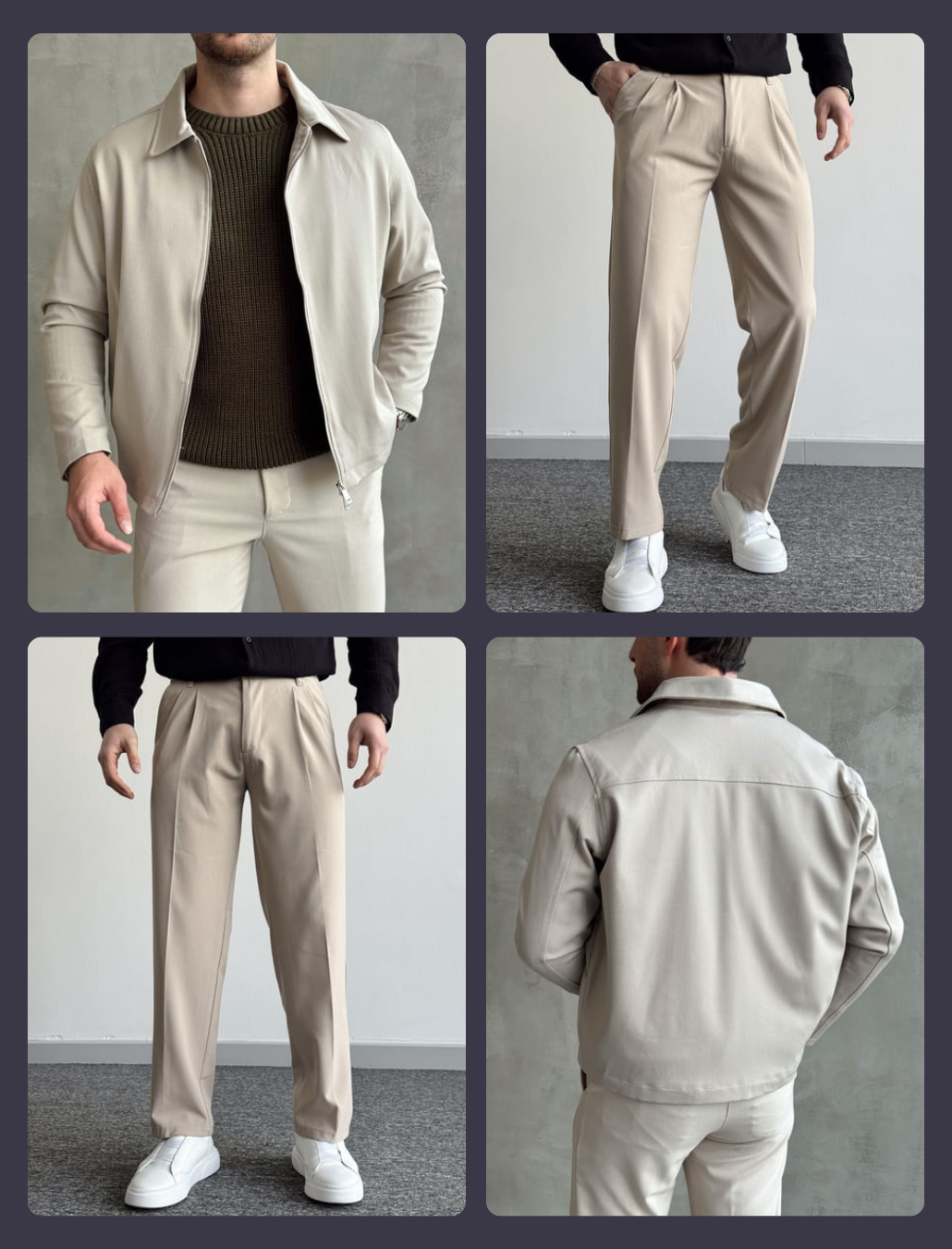 Cet ensemble marie une veste oversize en gabardine premium et un pantalon plissé à coupe droite, pour une allure à la fois décontractée et aristocratique. Pensé pour les amateurs du style old money, il se décline en plusieurs couleurs raffinées, du beige classique au brun profond et noir en passant par des tons neutres élégants.